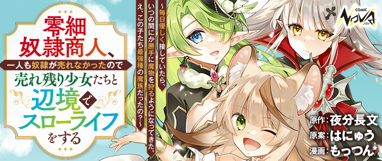 株式会社エディア(本社:東京都千代田区、代表取締役社長:賀島 義成)の子会社、株式会社一二三書房(本社:東京都千代田区、代表取締役社長:山崎 篤、以下:一二三書房)は、エンターテインメント小説レーベル『サーガフォレスト』にて発売中の小説「零細奴隷商人、一人も奴隷が売れなかったので売れ残り少女たちと辺境でスローライフをする~毎日優しく接していたら、いつの間にか勝手に魔物を狩るようになってきた。え、この子たち最強種の魔族だったの?~」のコミック版を一二三書房オリジナルコミックレーベル『コミックノヴァ』にて本日17時より連載開始することをお知らせいたします。