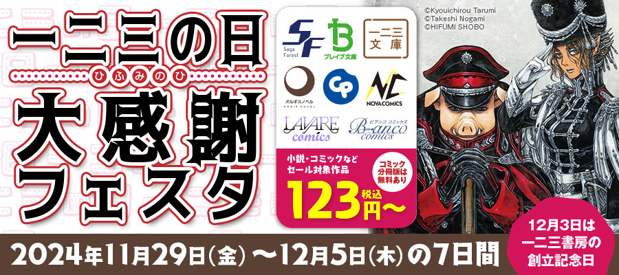 株式会社エディア(本社:東京都千代田区、代表取締役社長:賀島 義成)の子会社、株式会社一二三書房(本社:東京都千代田区、代表取締役社長:山崎 篤、以下:一二三書房)は、12月3日の創立記念日に合わせ、2024年11月29日(金)より12月5日(木)まで『一二三の日 大感謝フェスタ』を各電子書籍配信サイトにて開催することをお知らせいたします。